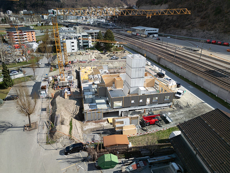Neben dem Holzbau schreitet auch der Rohbau weiter voran: Die Bodenplatte neben dem Liftschacht wurde betoniert, und ein Teil der Decke des Parkhauses konnte bereits erstellt werden.